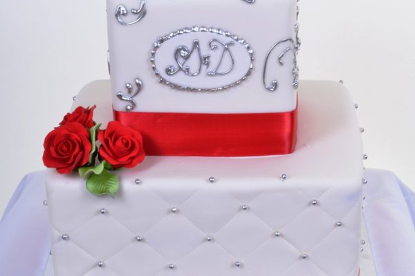 Two square fondant wrapped layers lend a modern look to a fresh color palette of white, red and silver. The details are classic. Chanel-esque quilting is accented by silver beads and the couple’s new monogram in silver is highlighted by silver icing scroll work. Both tiers are finished with red satin ribbon, while lifelike red icing roses and leaves add the perfect finishing touch. Picture it finished with the colors of your wedding theme .
