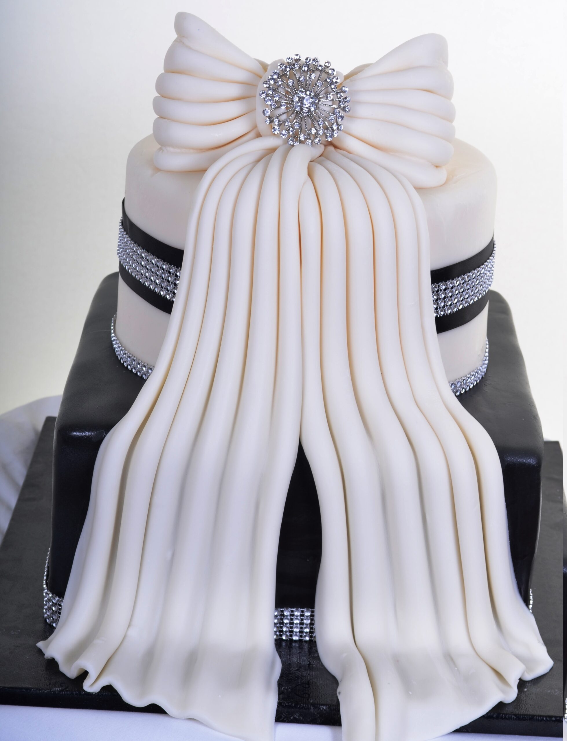 The dramatic presence of this sculpted oversized icing bow unmistakably dominates this piece.Shown above in a two-tier design of round white cake on square black with a stylized touch elegance.The crystal ribbons and sparkling decoration accenting the bow add a special touch of glitz to the effect.Stark black and white always express that certain savoir faire, and this design will command attention.