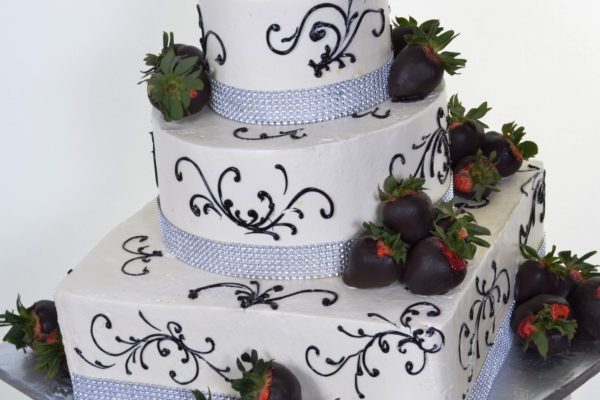 For some, a wedding cake represents a choice – between what they really love, and what they want to see.Here, the couple of the day can choose both in one very appealing blend.Strawberries!Chocolate!Diamonds!Well, not diamonds, but flashy crystal ribbons adorn the base of all three tiers, which are subtly ornamented with swirls of chocolate filigree.The mix of the square bottom tier, and the two round ones, adds another dimension to this showpiece.The scrumptious chocolate-dipped strawberries add a soupçon of color; while the two strawberries at the top are appropriately decked out to stand in for “Bride and Groom.”