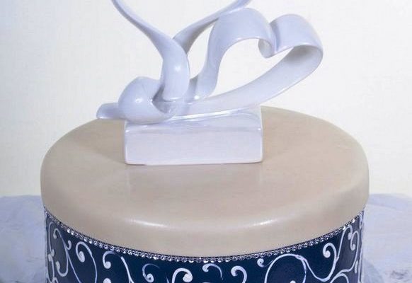 A broad blue band, enhanced by an edging of brilliant crystals at both top and bottom, draws the focus here.This simple and distinguished design, elegantly rendered, is crowned by the graceful double-heart ornament.A single tier, a petite presentation – and yet boldly executed and a cake that proudly holds its own among larger designs boasting more real estate.