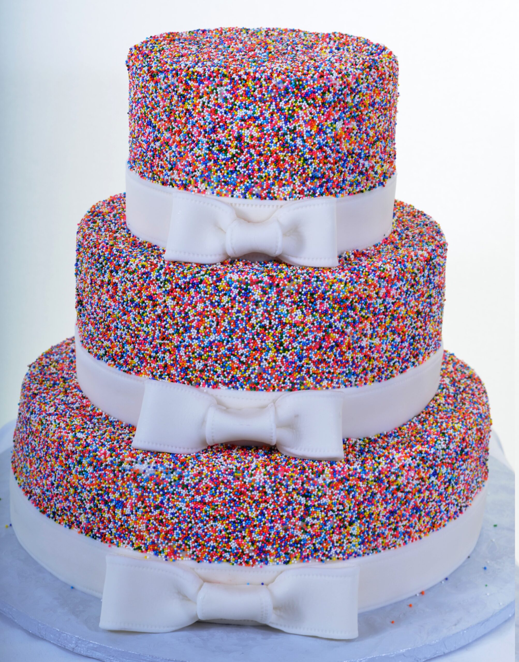 This sprinkle-studded confection is a treat for the eyes.Each of these three tiers is jam-packed with a rainbow of sprinkles that might be mistaken for confetti.The pristine white ribbon bands, each adorned with a handsome classic bow, attractively define the tiers.This design says “Let’s have a party!”
