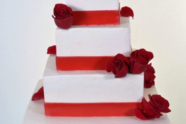 An affair in red squares, indeed!This tower of four tiers, wrapped in broad red ribbon bands is strikingly handsome.Snowy white fondant provides the perfect contrast to the rich red of the ribbons.Startling crimson roses, and the occasional stray petal, soften the geometric concept without subtracting from its dramatic statement.