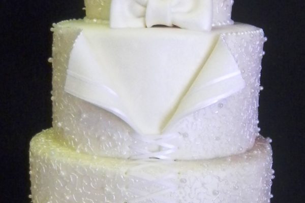 A majestic piece on its own, this glorious presentation of five round, stacked tiers creates an illusion of bridal elegance and detail.Delicately placed hand-piped scrollwork adorns each layer in different patterns – just as you’ll probably find on the brides own dress.Laces, pearls, gems, and white peonies add luster, detail and romance – along with the huge and trailing bow of white fondant that dominates this design.
