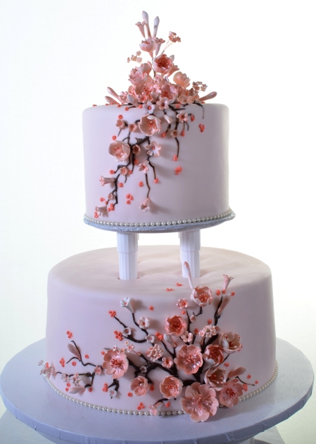 The very image of spring, romance, and a whiff of scented blooms, this quiet double-tier cake presents with a smooth matte finish of pale pink.Adorning the design from top to bottom are meticulously created branches and tiny cherry blossom flowers that wind softly and elegantly around the base.Pink pearl trim highlights each tier, and there’s no need for a cake topper here – the delicate bouquet atop is beauty personified.