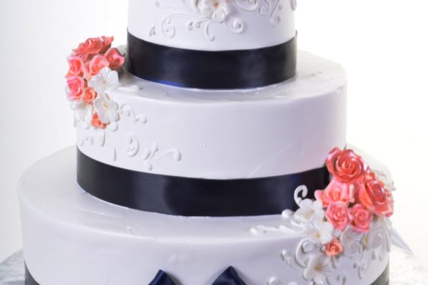 It can be the simplest of designs that makes the most striking presentation.Take this look, for example.A triple stacked tier of snow white buttercream is where you start.Accent with wide ribbons of deep ocean blue around each tier – and top off with a bow.And then – like a surprise, small and delicate sprays of coral roses rest on each tier, the design extended just a bit farther in white flowers and scrolls.And then – stop.You’ve created the perfectly adorned yet understated wedding cake design.