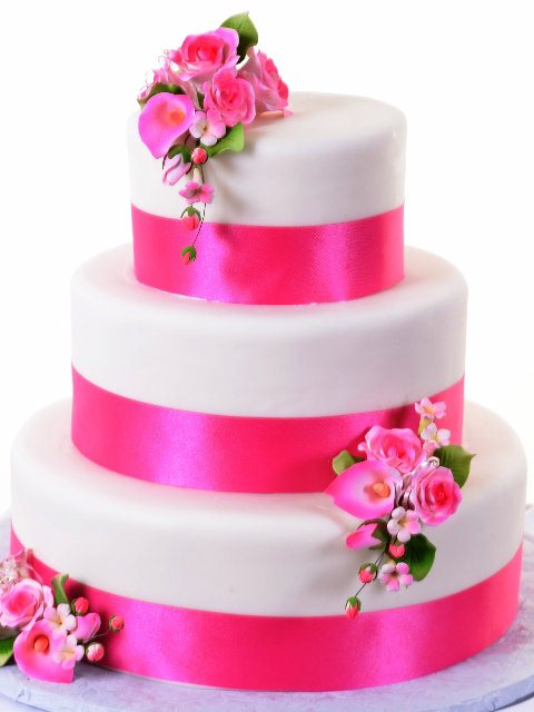 Smooth and sleek – this is a design that can’t help but make you smile.Flush with all the joy of nature at its brightest and best – this three-tier round design is elegance personified, with a sense of style.The elegance is obvious in the smooth, matte sheen of the fondant covering each tier.The style – let’s have some fun with “pink” and do it with class.The handful of tiny floral sprays feature blooms of such detail you can almost catch a whiff of scent.This is a wedding cake for an Audrey Hepburn-spirit.