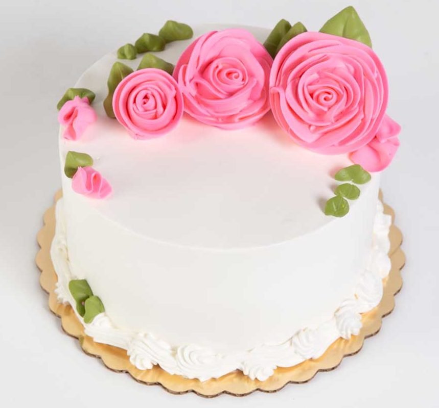 A single tier buttercream iced cake with pink chocolate curls on the bottom.