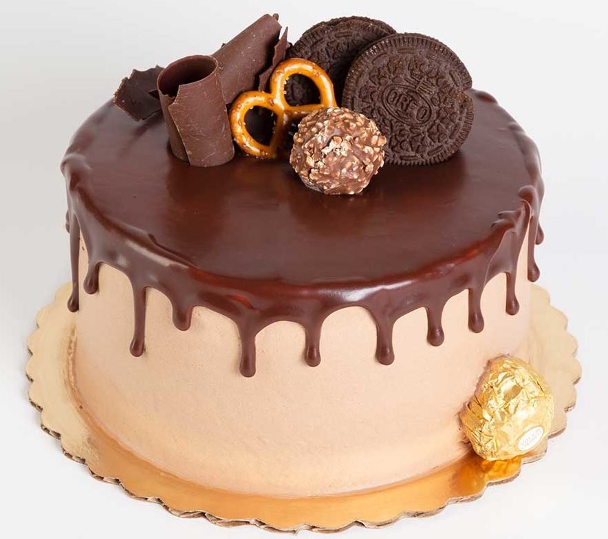 This cake is made with chocolate cake and chocolate cream and then iced in chocolate cream with ganache drizzle and chocolate pieces on top.